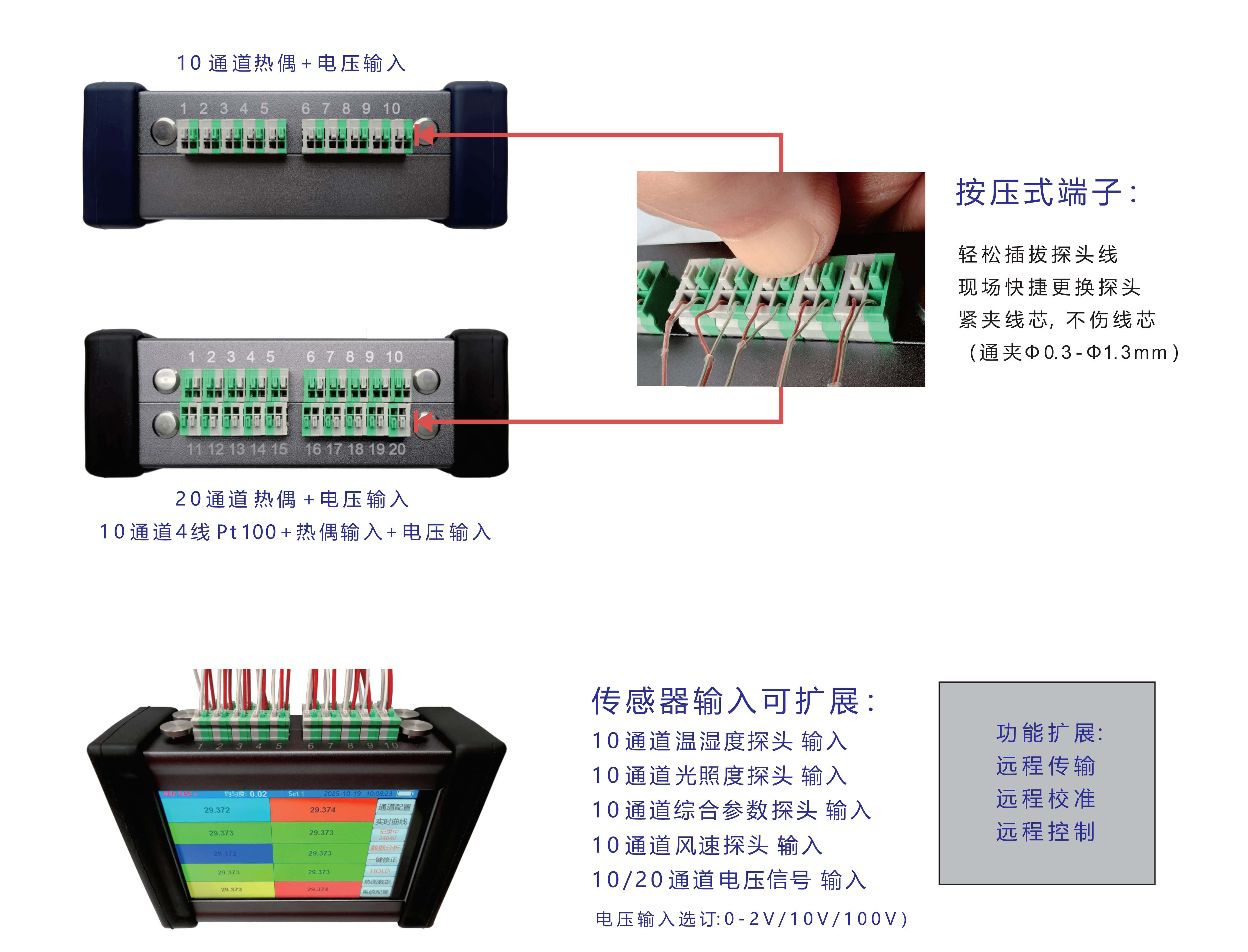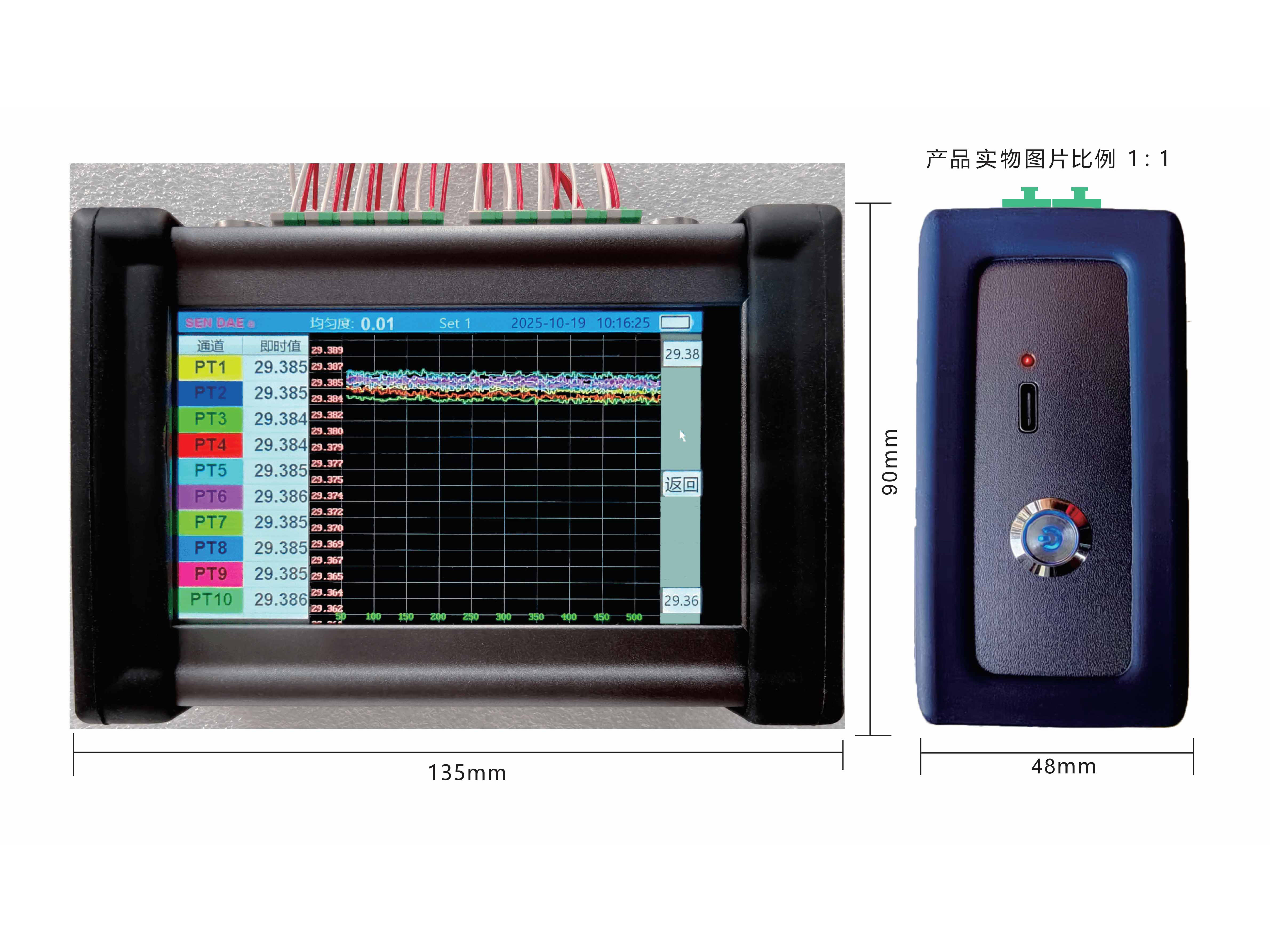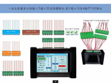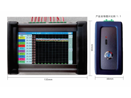 仪器概述: 显示器:4.3”电容屏,显示分辨率:800x480 内存:32G(可扩展64G) 热偶精度:±(0.15℃+0.15%,不同热偶类型和温区偏差有差异,建议优选T和B型热偶) 热阻精度:±(0.01℃+0.05%) 电压精度:±0.05% 分辨率:0.1/0.01/0.001切换(热偶输入2位小数点) 数值刷新:标准 0.1s(全通道同时) 曲线刷新:0.2s 外型尺寸:130x90x48mm(含护套尺寸) 壳体材质:铝合金外+硅胶护套 重量:500g 记录间隔: 标准为0.1s 以上自设间隔,0.1s时不能同时打开曲线界面(选订0.01s/0.001s)导出数据:EXCEL格式,USB连接电脑,USB外供电 供电: 内置 8000mAh电池, 续航能力:(省电模式下)以10 通道算连续30小时;以20通道算连续20小时